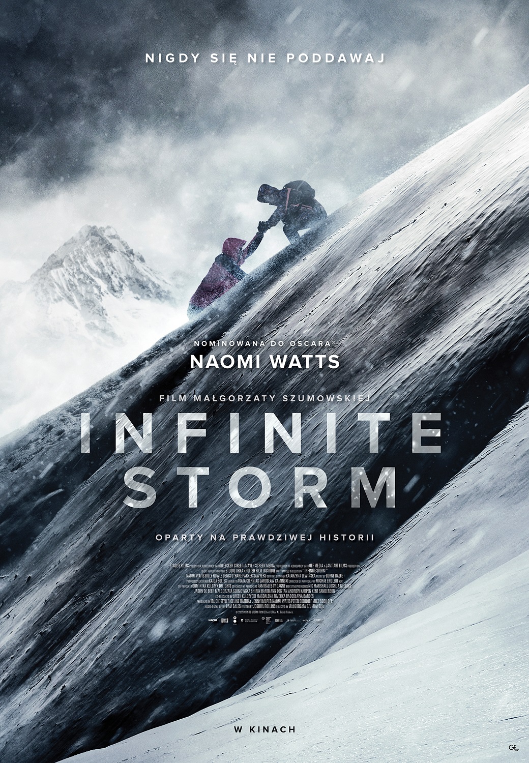„Infinite Storm”, pierwszy amerykański film Małgorzaty Szumowskiej, to zapierająca dech w piersiach i mrożąca krew w żyłach wyprawa w jedno z najbardziej niebezpiecznych górskich pasm świata, gdzie porywy wiatru sięgają 300 km na godzinę, a pogoda zmienia się nieustannie. To również opowieść o innych żywiołach: stracie, ryzyku i odwadze, która pozwala wyjść cało z najgorszej życiowej nawałnicy. Główną rolę w inspirowanym prawdziwą historią thrillerze zagrała hollywoodzka gwiazda Naomi Watts („Niemożliwe”, „Birdman”, „Mulholland Drive”), w idealnych proporcjach łącząc kruchość z niezłomnością.